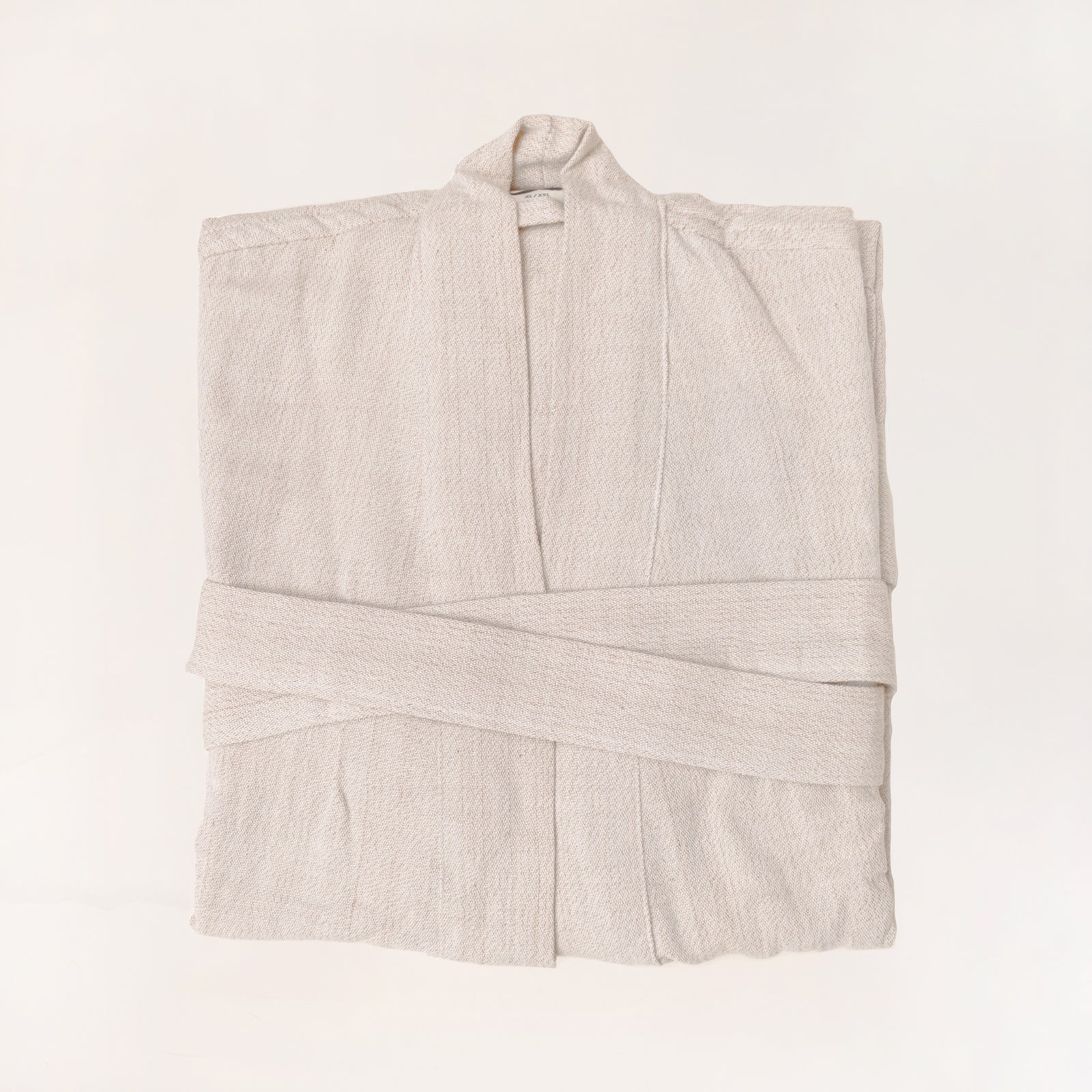 Dieser cremefarbene, naturbelassene Bademantel, handgewebt auf traditionellen Webstühlen, verkörpert die Essenz schlichter Eleganz. Die Mischung aus Leinen und Baumwolle bietet dir Komfort, der lange anhält, während du dich nach einem langen Tag oder einer heißen Dusche entspannst.