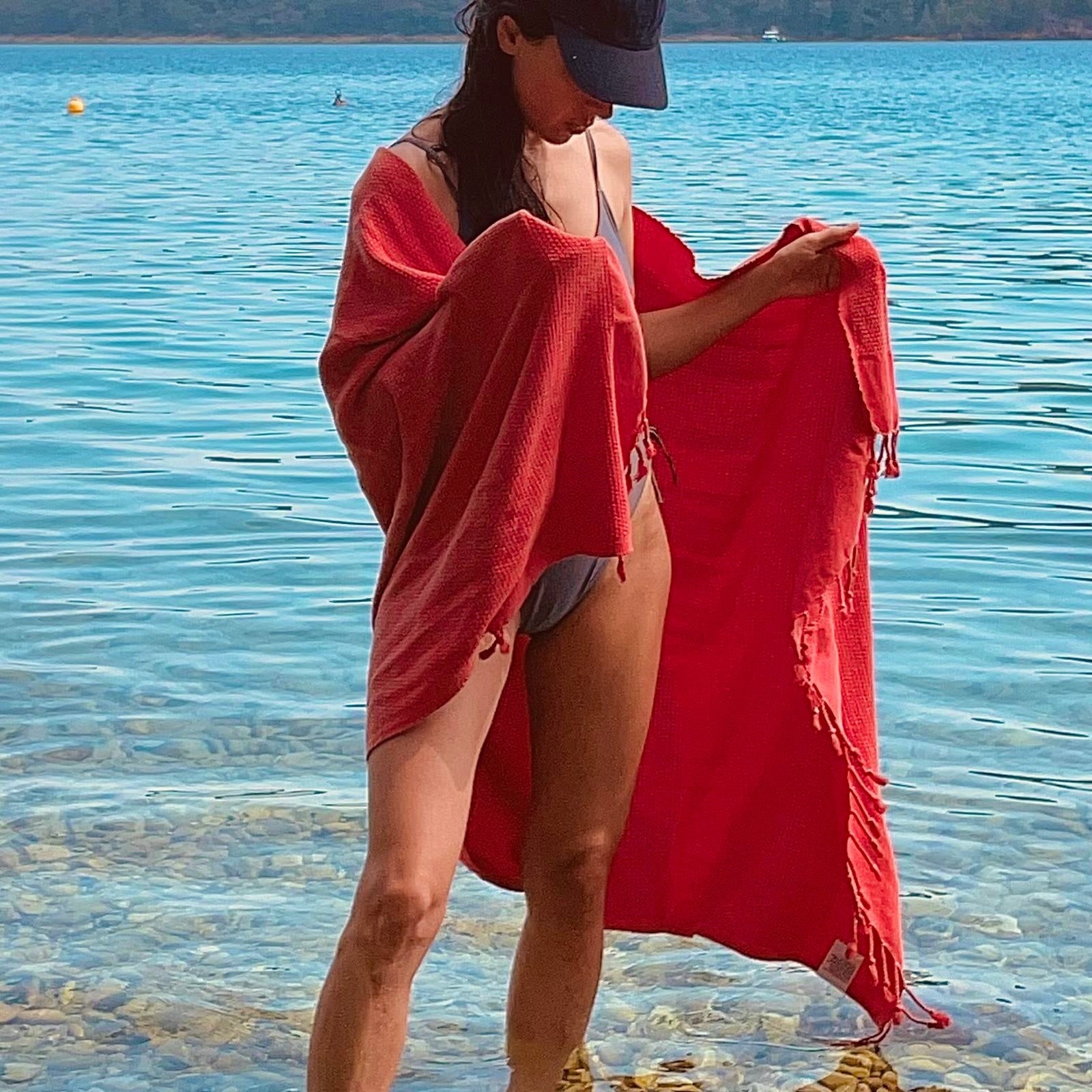 Our 'Red and Ready' towel stands out with its exceptional thickness and ultra-soft feel, offering a level of comfort that surpasses most Turkish towels. Designed for those who appreciate luxury and practicality, it is perfect not only for the beach or sauna but also for enhancing your self-care routine at home.