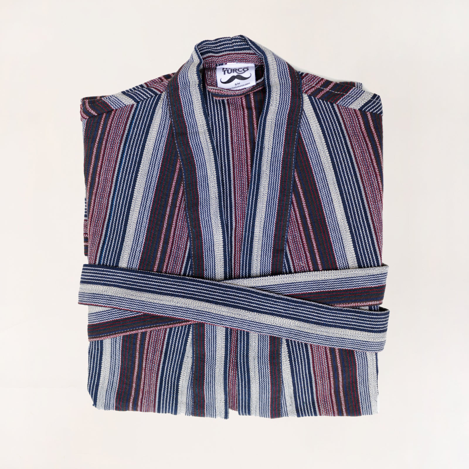 Mit tiefem Burgunderrot und feinen traditionellen Streifen, handgewebt auf jahrhundertealten Webstühlen, bietet dieser Bademantel die perfekte Balance zwischen Stil und Komfort. Sein weiches Leinen-Baumwoll-Mischgewebe sorgt für ein luxuriöses Tragegefühl und hält dich warm nach einer erholsamen Dusche oder einem Saunagang.